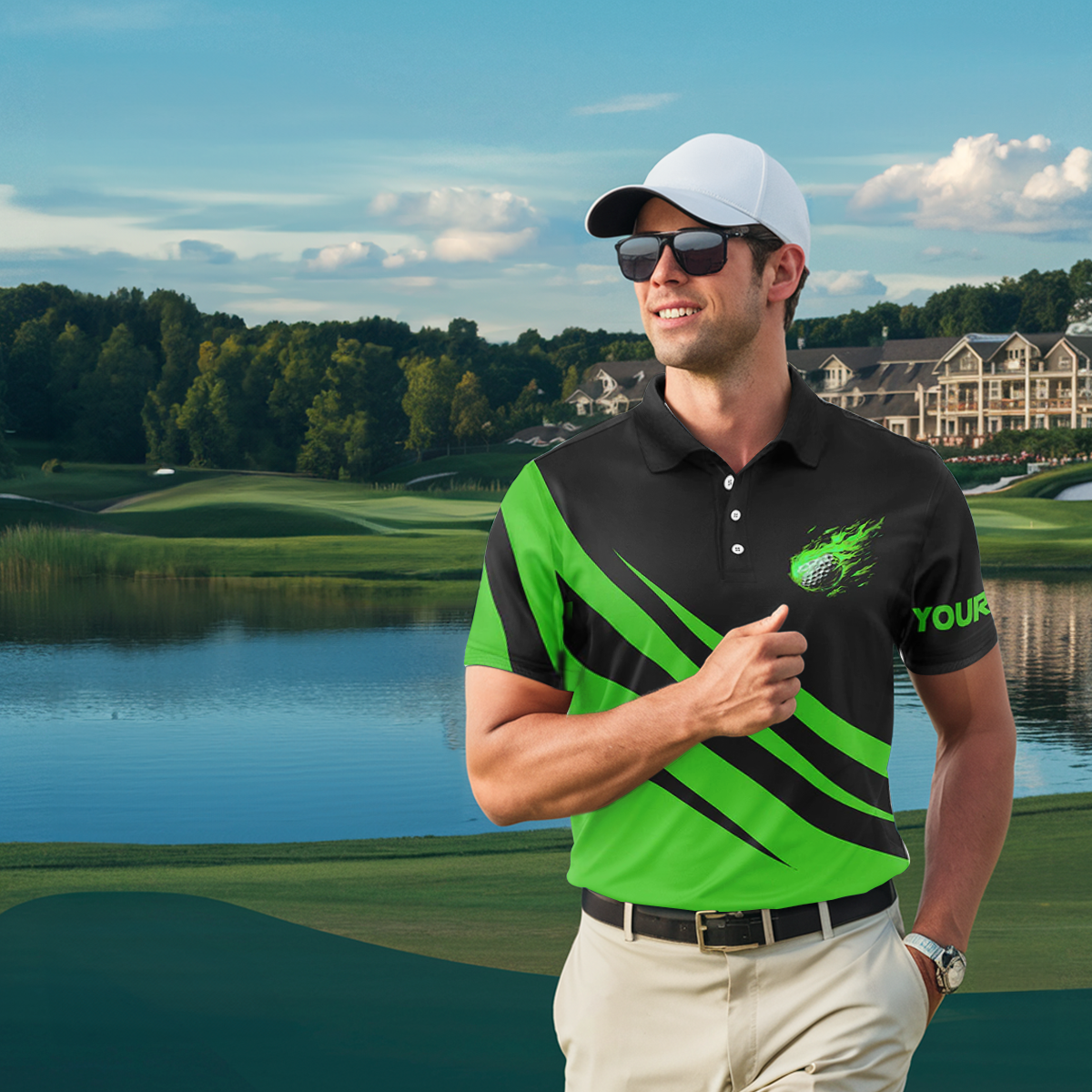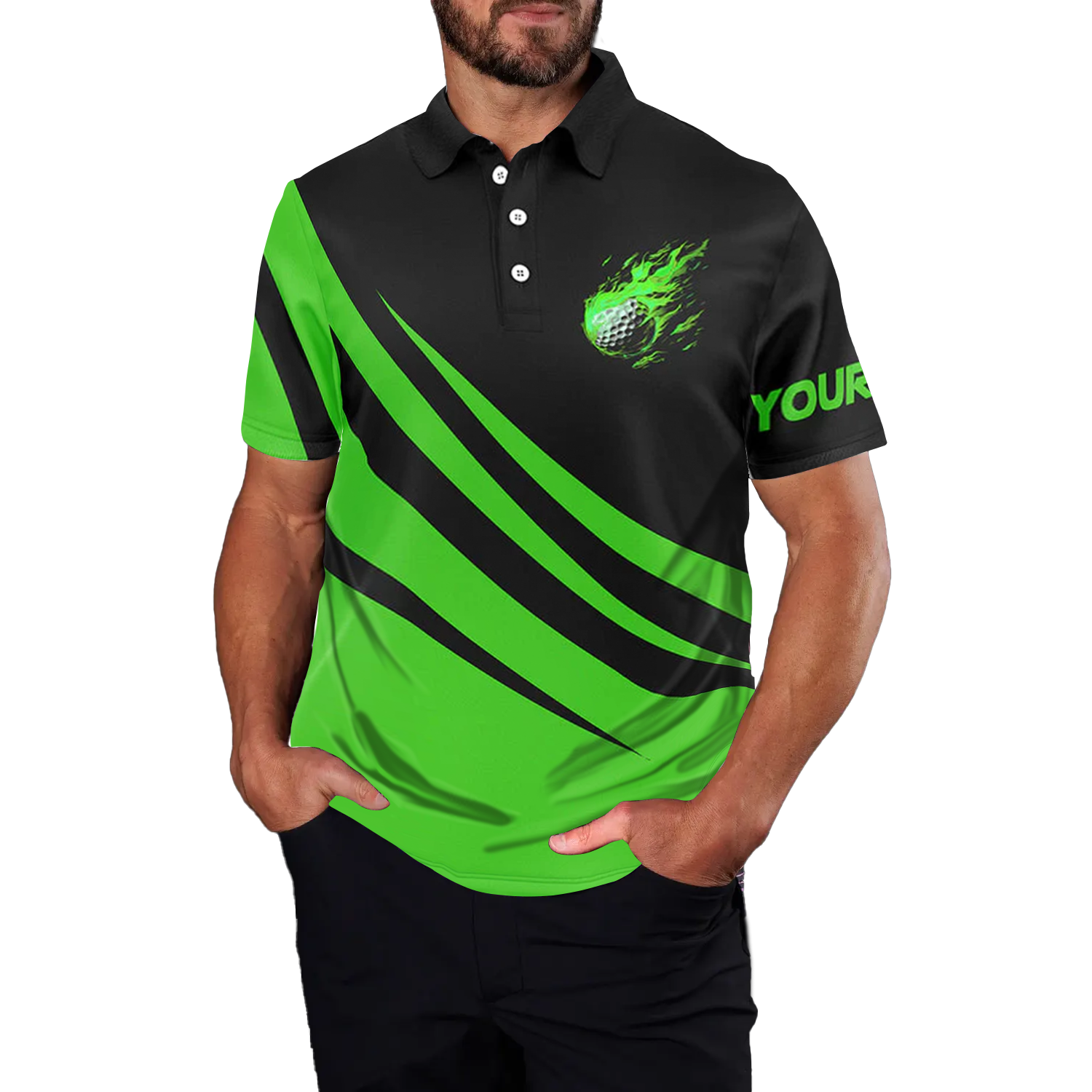 Individuelles Herren Golf Poloshirt mit Flammenmuster in Schwarz und Grün - Perfektes Geschenk für Golfer N7399