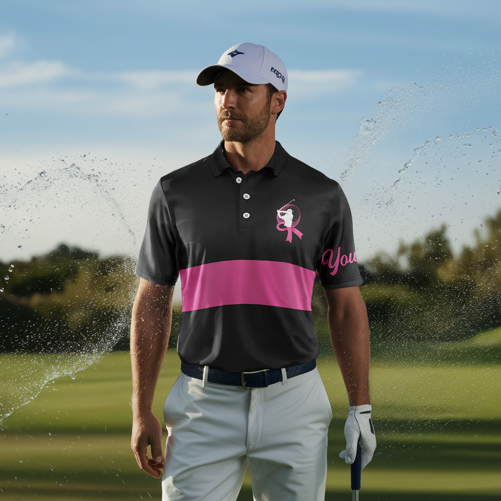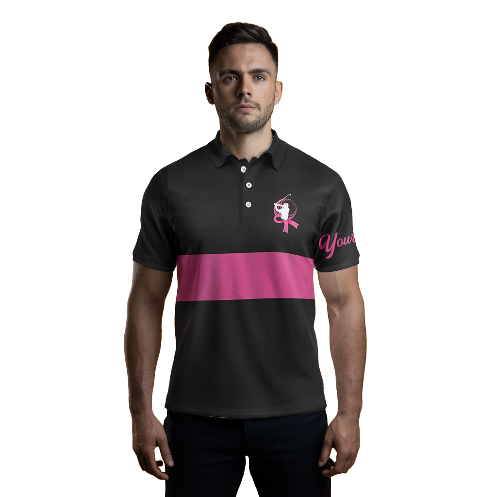 Personalisierte Herren Golf Poloshirts in Schwarz und Pink – Brustkrebs-Bewusstsein mit pinkem Band N6293
