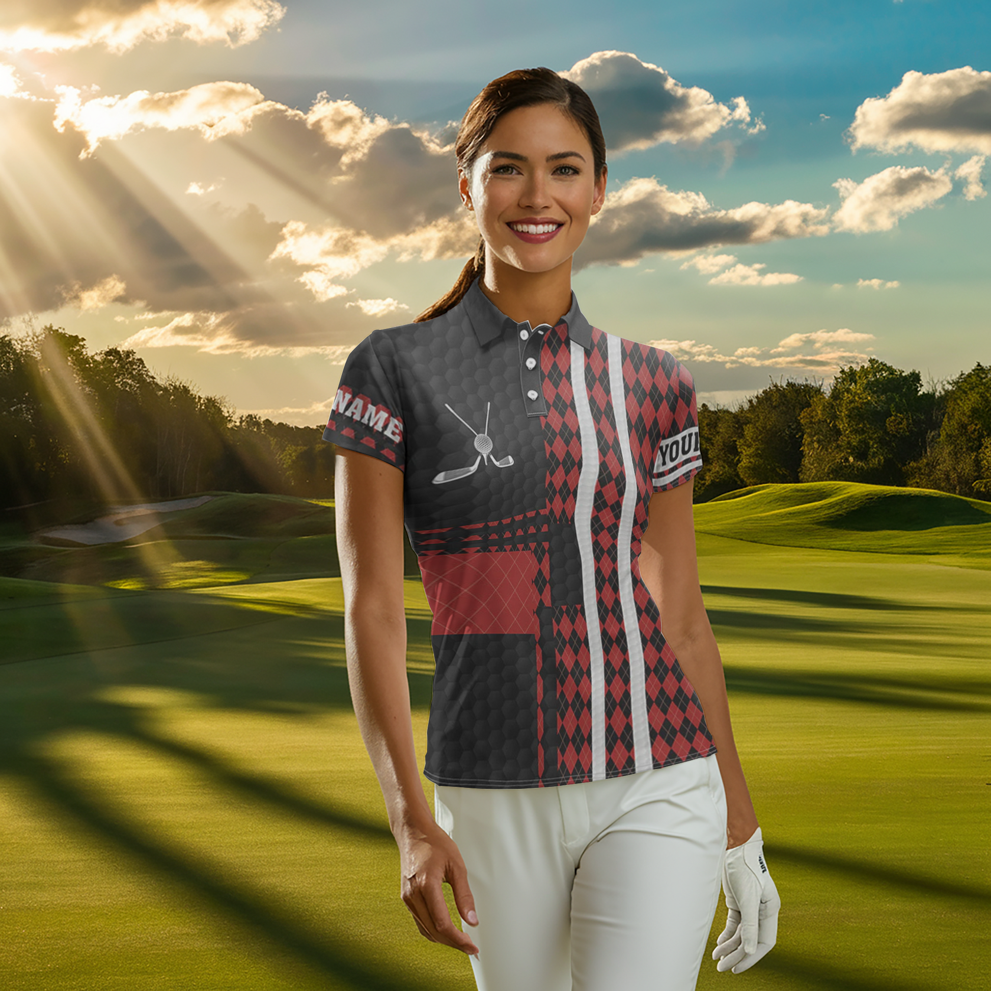 Personalisierte Damen Golf Polo Shirt mit Schwarz-Rotem Rautenmuster - Einzigartiges Geschenk für Golferinnen N7089