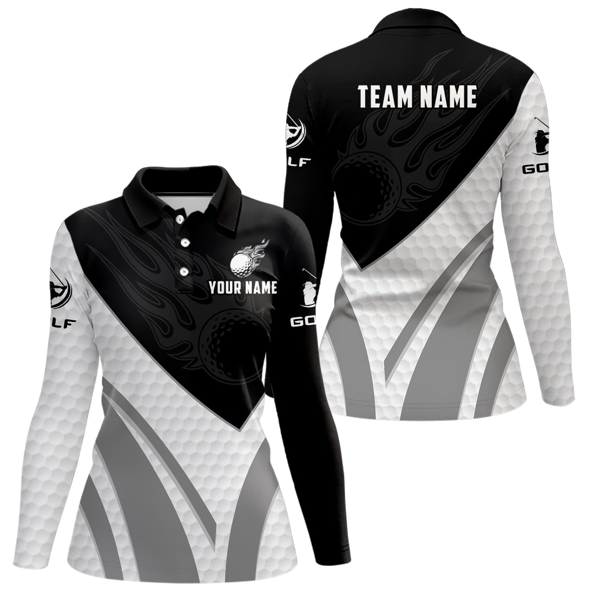 Damen Golf Polo-Shirt in Schwarz-Weiß mit individuellem Golfball-Feuerdesign – Stylisches Golfoberteil für Damen N7063
