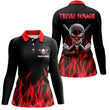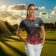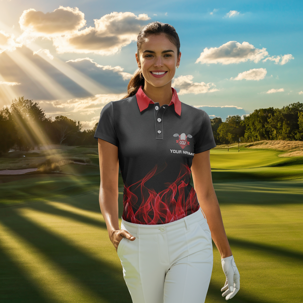 Individuelles schwarzes Golf-Polo-Shirt für Damen mit rotem Flammenschädel und Golfschlägern – Persönliches Golfgeschenk für Sie N6258