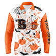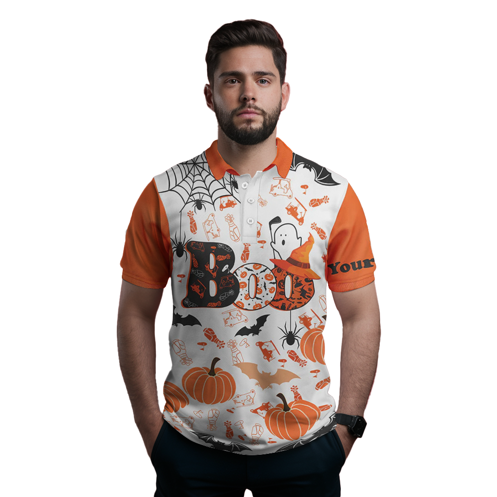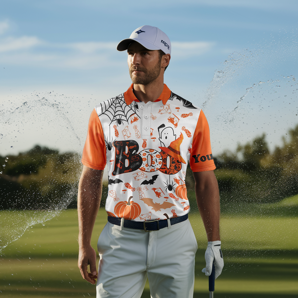 Gruseliges Halloween Golfmuster Polo-Shirt in Orange | Personalisierte, humorvolle Golf-Shirts für Männer | Perfekte Golf-Geschenke L0345