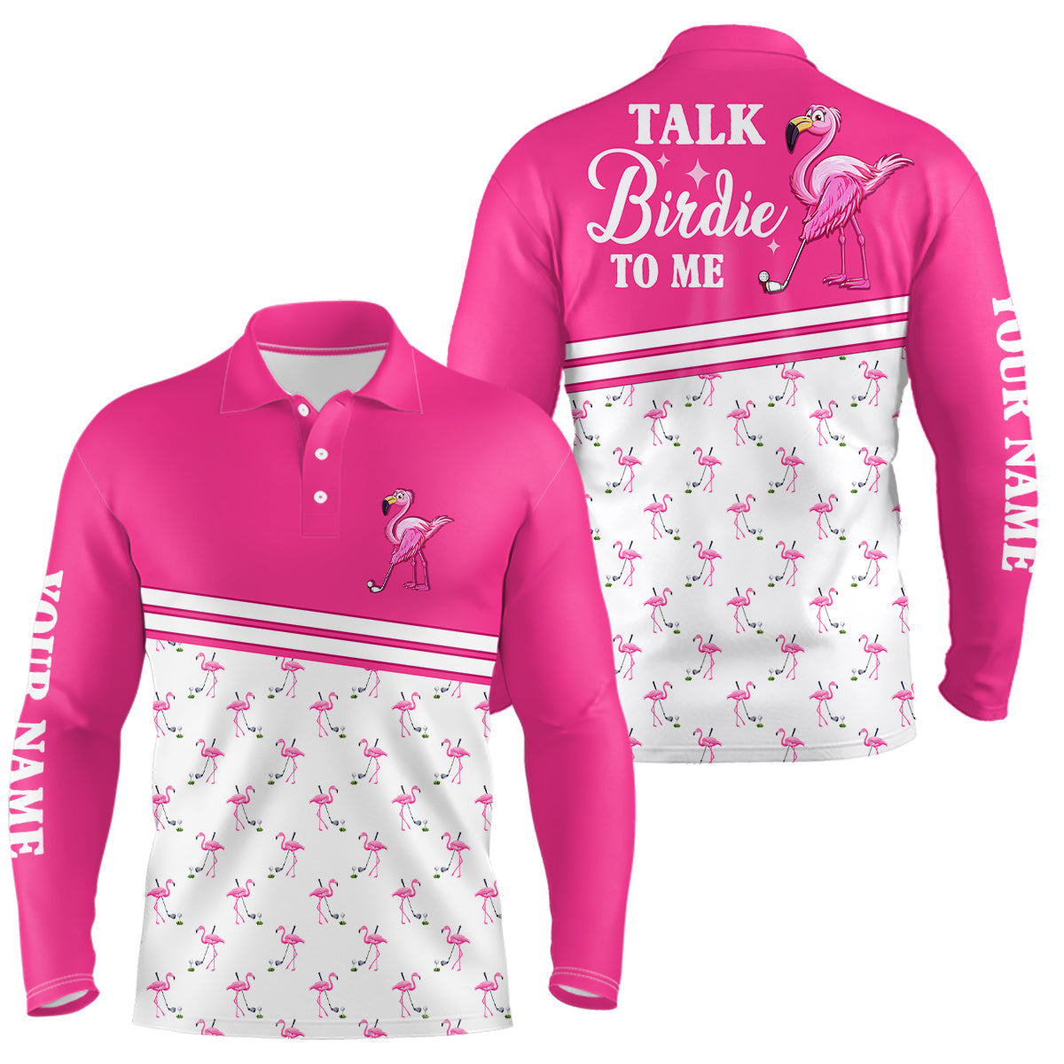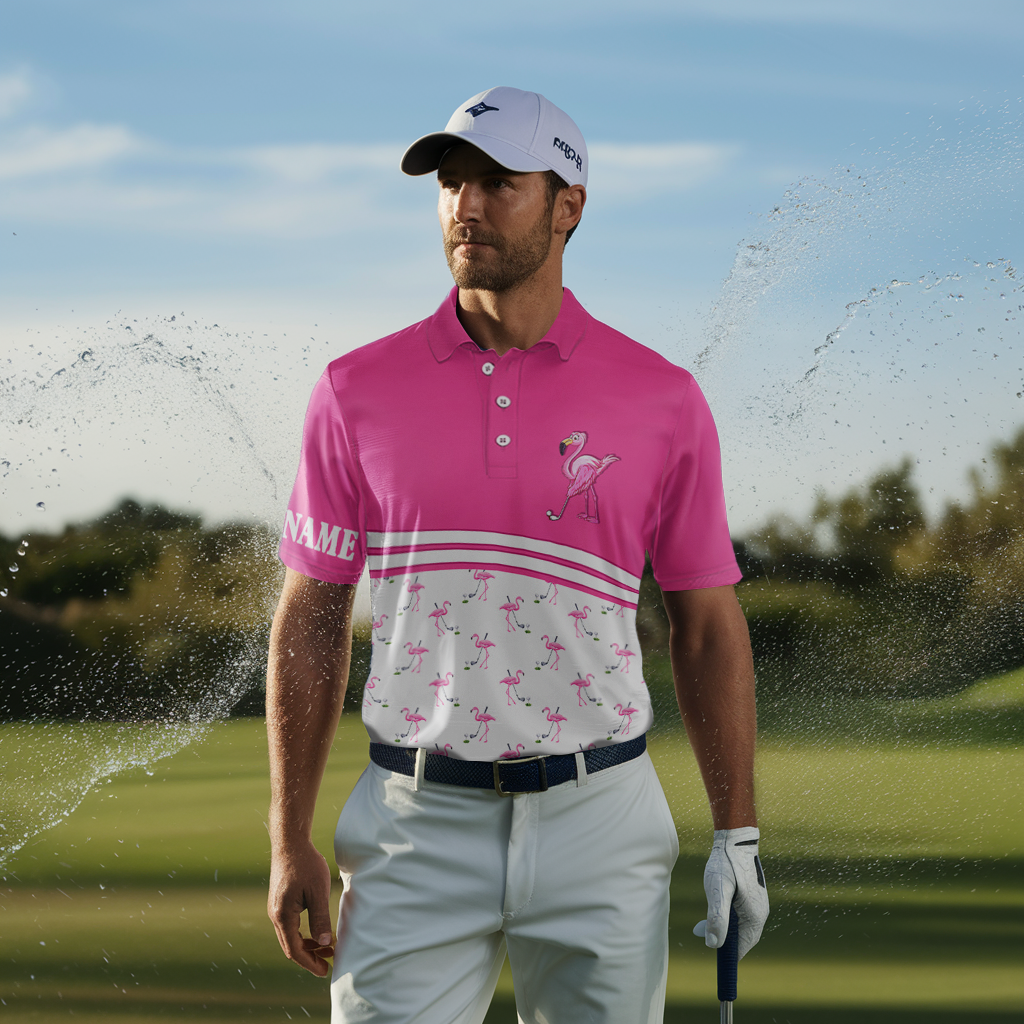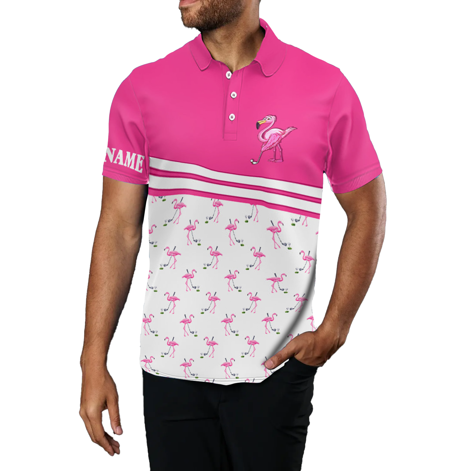 Herren Golf Polo Shirt mit individuellem Flamingo-Design in Rosa und Weiß - "Sprechen Sie mit mir, Vogel!" N7527