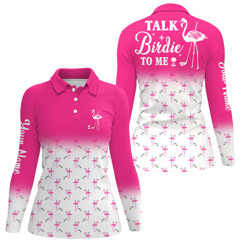 Frauen Golf Poloshirt mit Flamingo-Design in Pink und Weiß - "Spreche Birdie mit mir" - Lustiges Golfshirt N6118