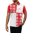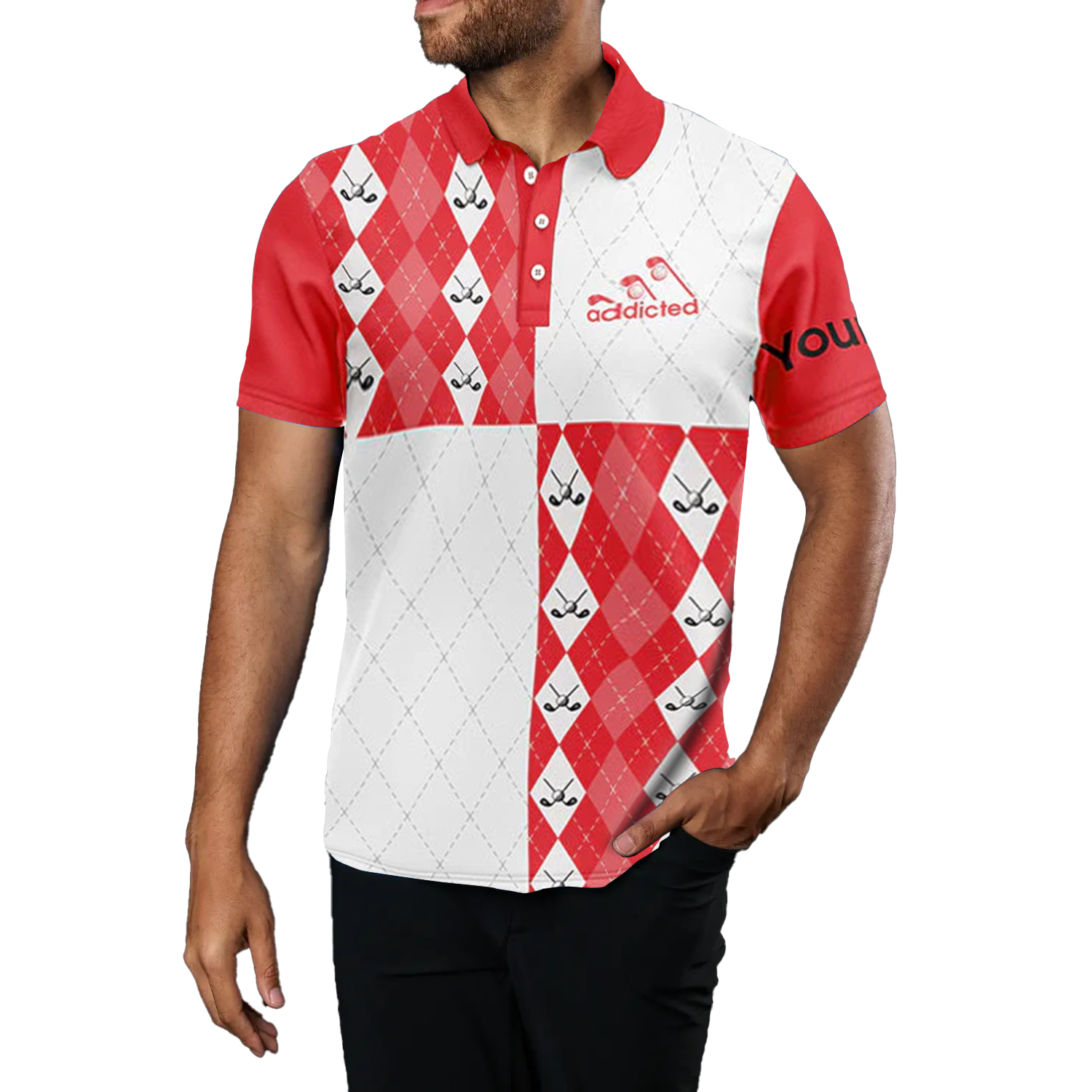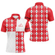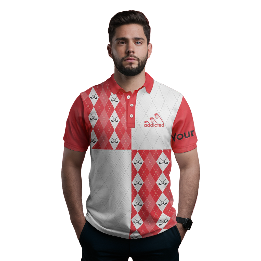 Individuelles Herren Golf Polo-Shirt in Rot und Weiß mit Argyle-Muster, Golfball und Schlägern N7446