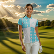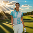 Frauen Golf Polo-Shirt in Cyanblau mit individuellem Golfball und Schlägern im Karomuster N7447