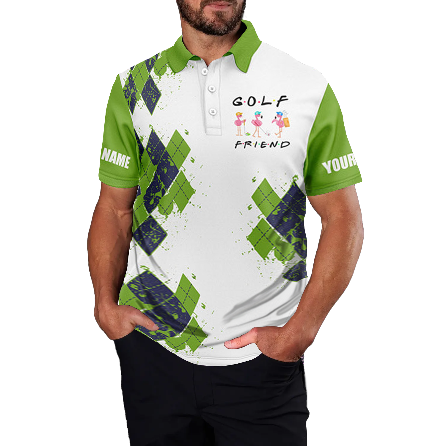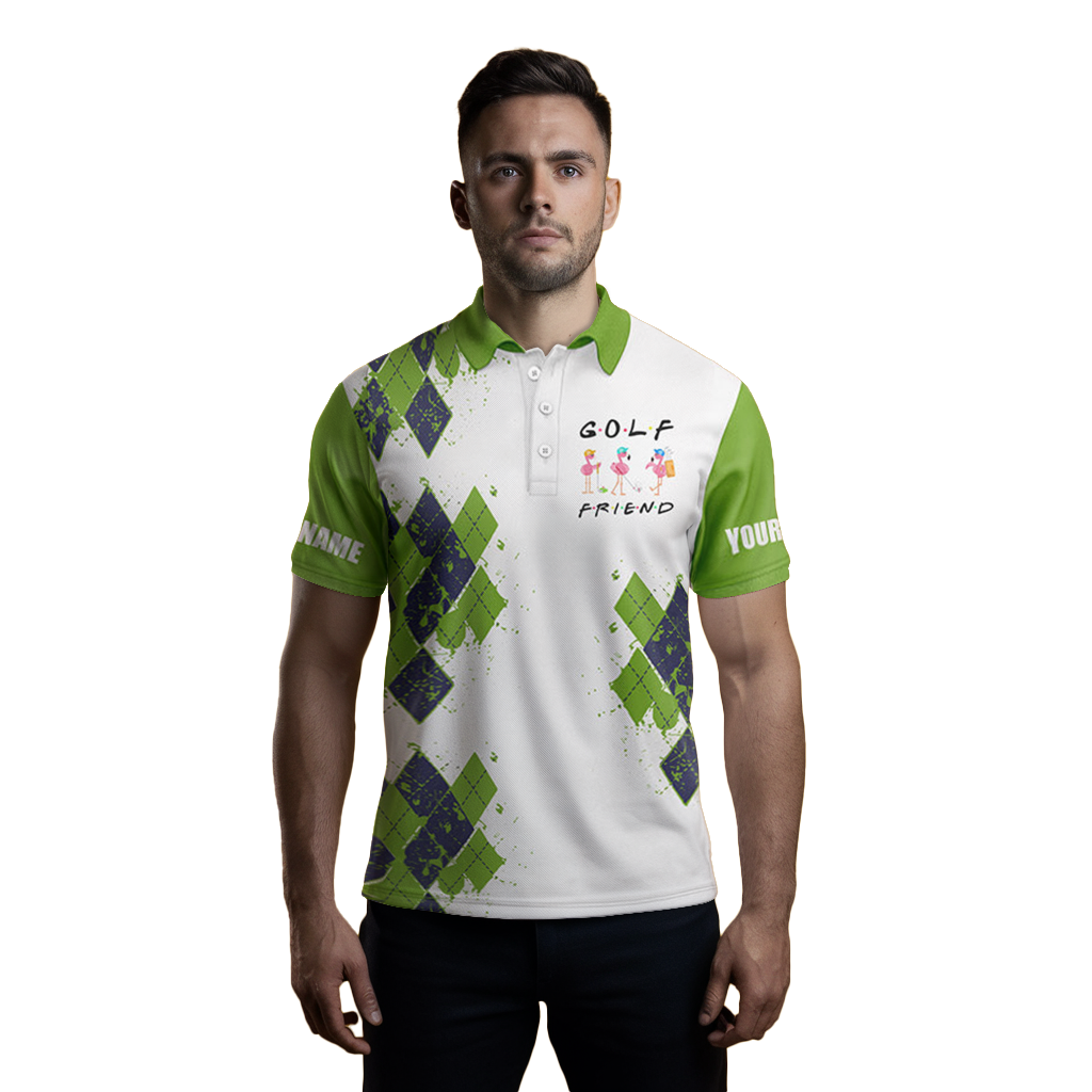 Personalisierte Herren Golf-Polo mit lustigem Flamingo-Design – Grün N3611