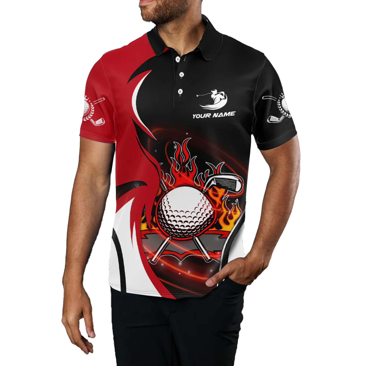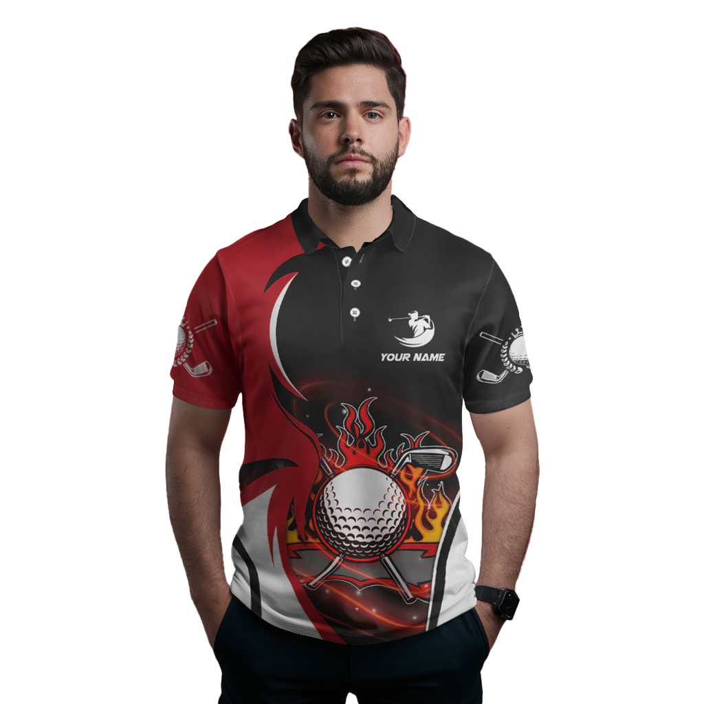 Personalisierte Golf-Polo-Shirts für Herren mit rotem und schwarzem Flammen-Design L0174