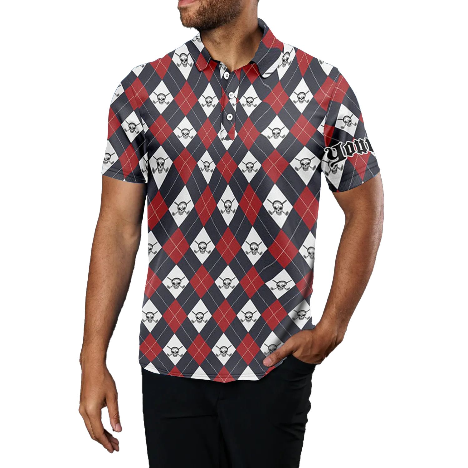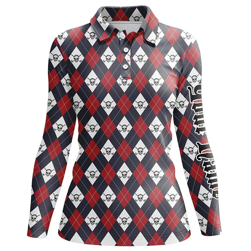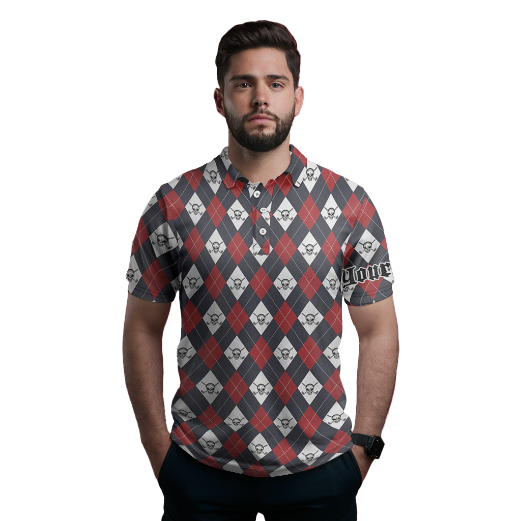 Personalisierte Golf-Polo-Shirts für Herren mit Argyle-Muster – Golf-Skull-Design – Individueller Teamname – Perfektes Golfgeschenk N6021