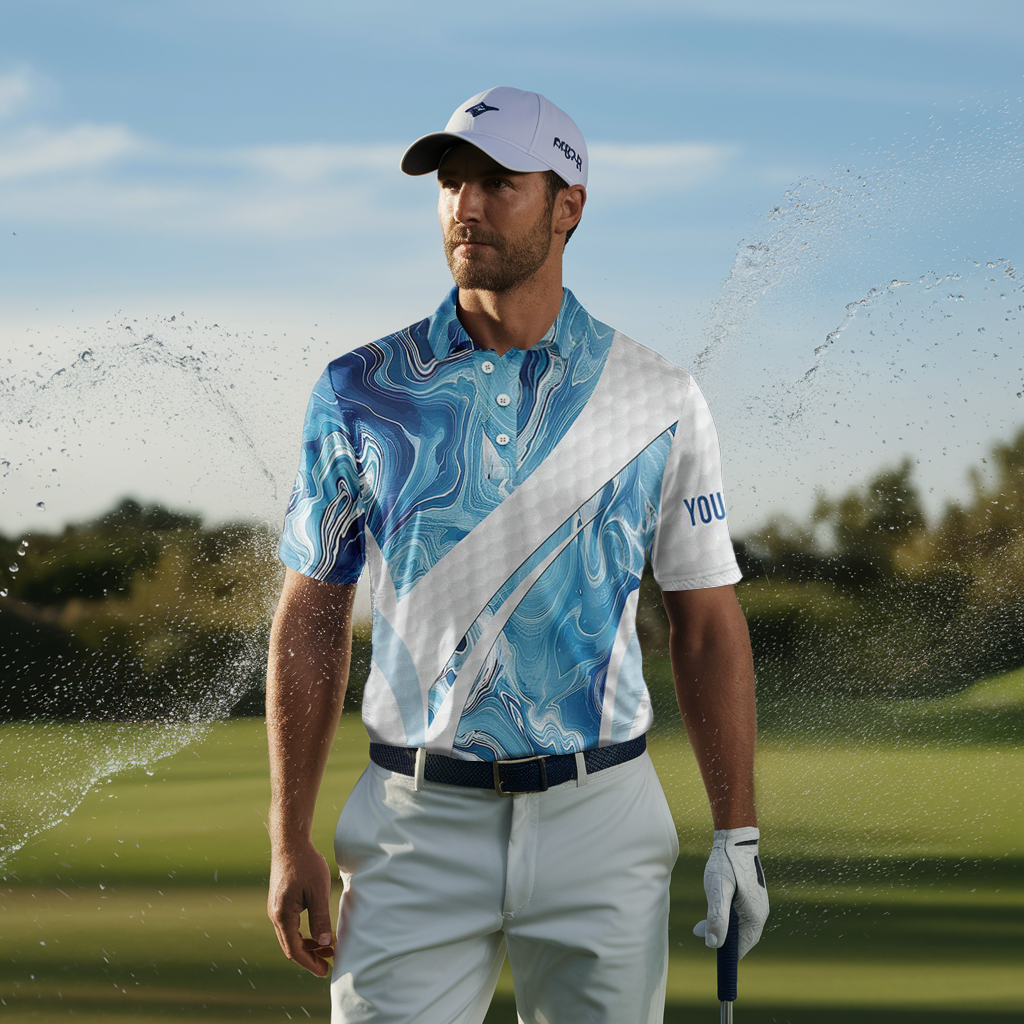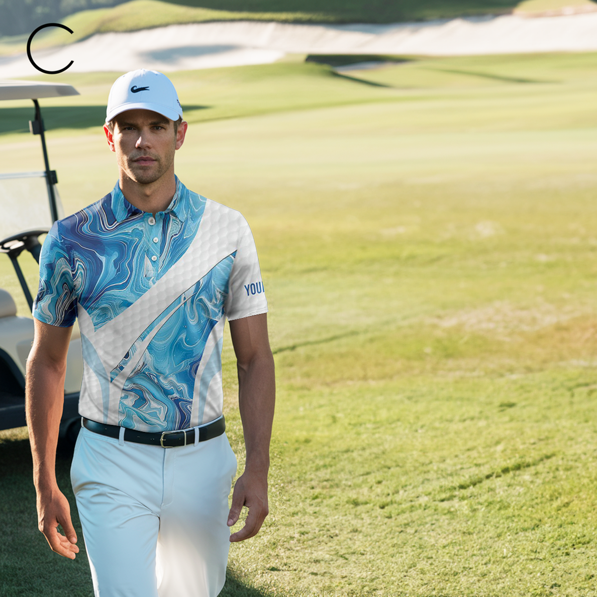 Herren Polo-Shirt in Blau mit Camouflage-Muster und weißem Golfball-Design – Das ideale Geschenk für Golfer N7512