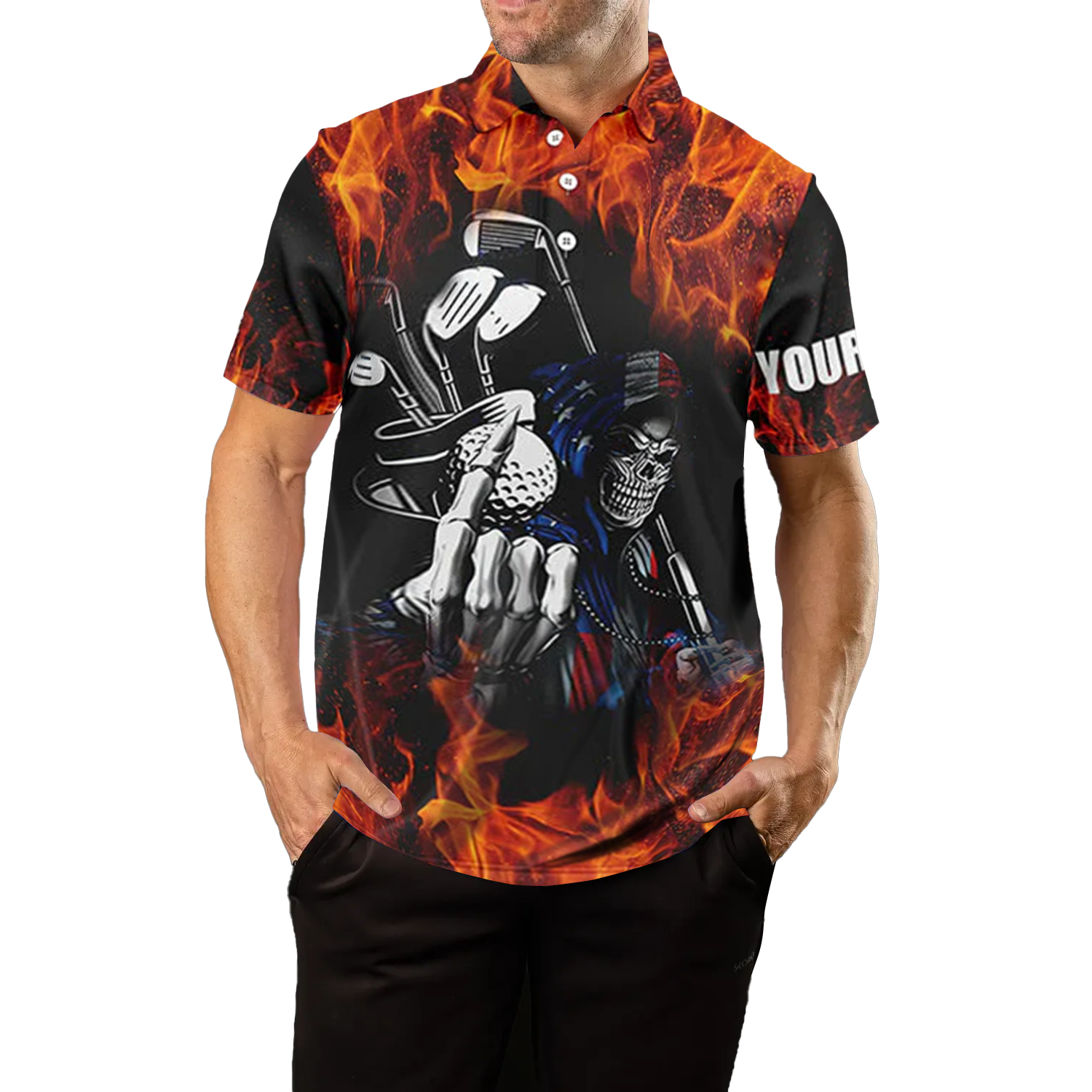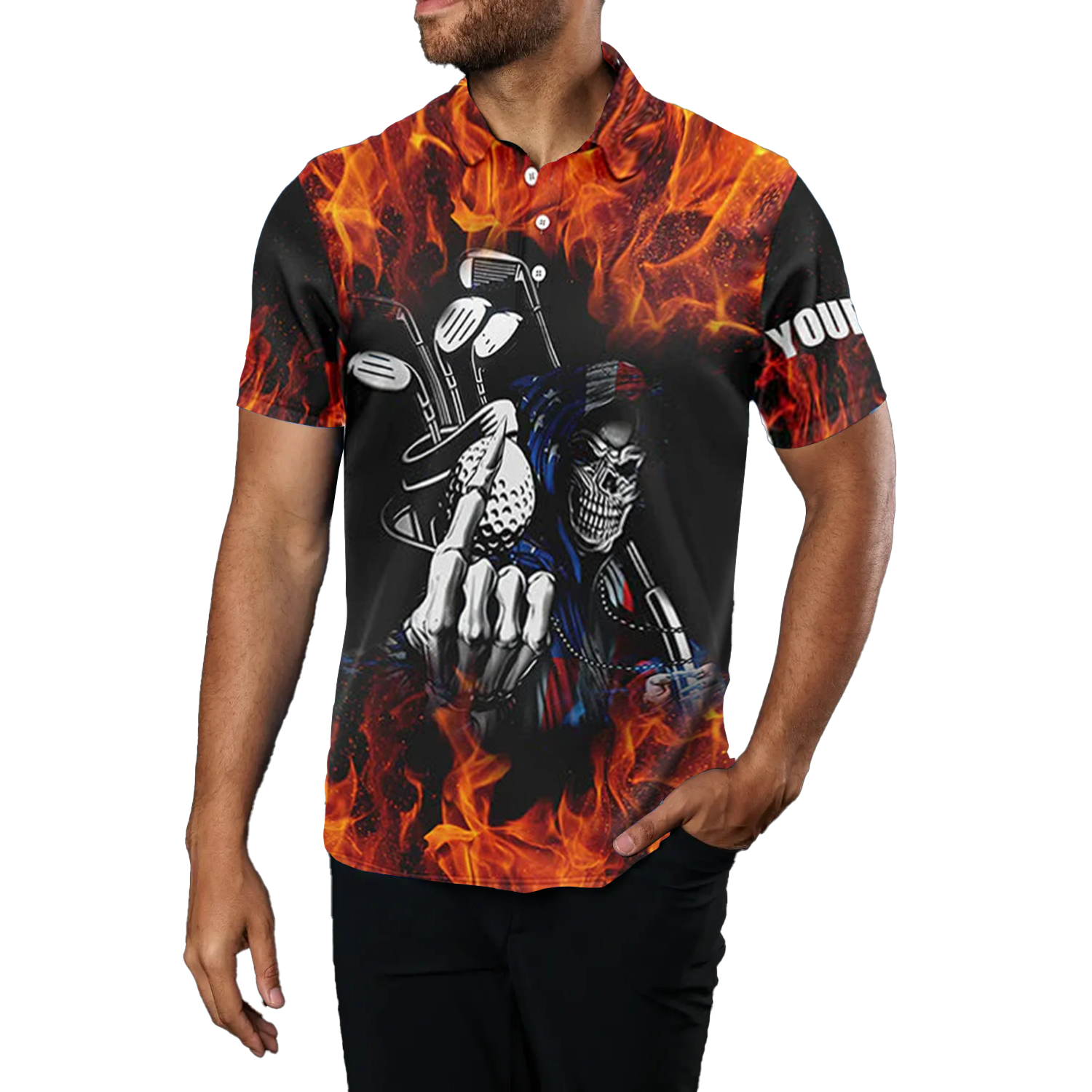 Individuelles Golf-Polo für Herren mit Feuer-Golf-Schädel-Design – Personalisierbar mit Ihrem Namen – Einzigartige Golfbekleidung N4467