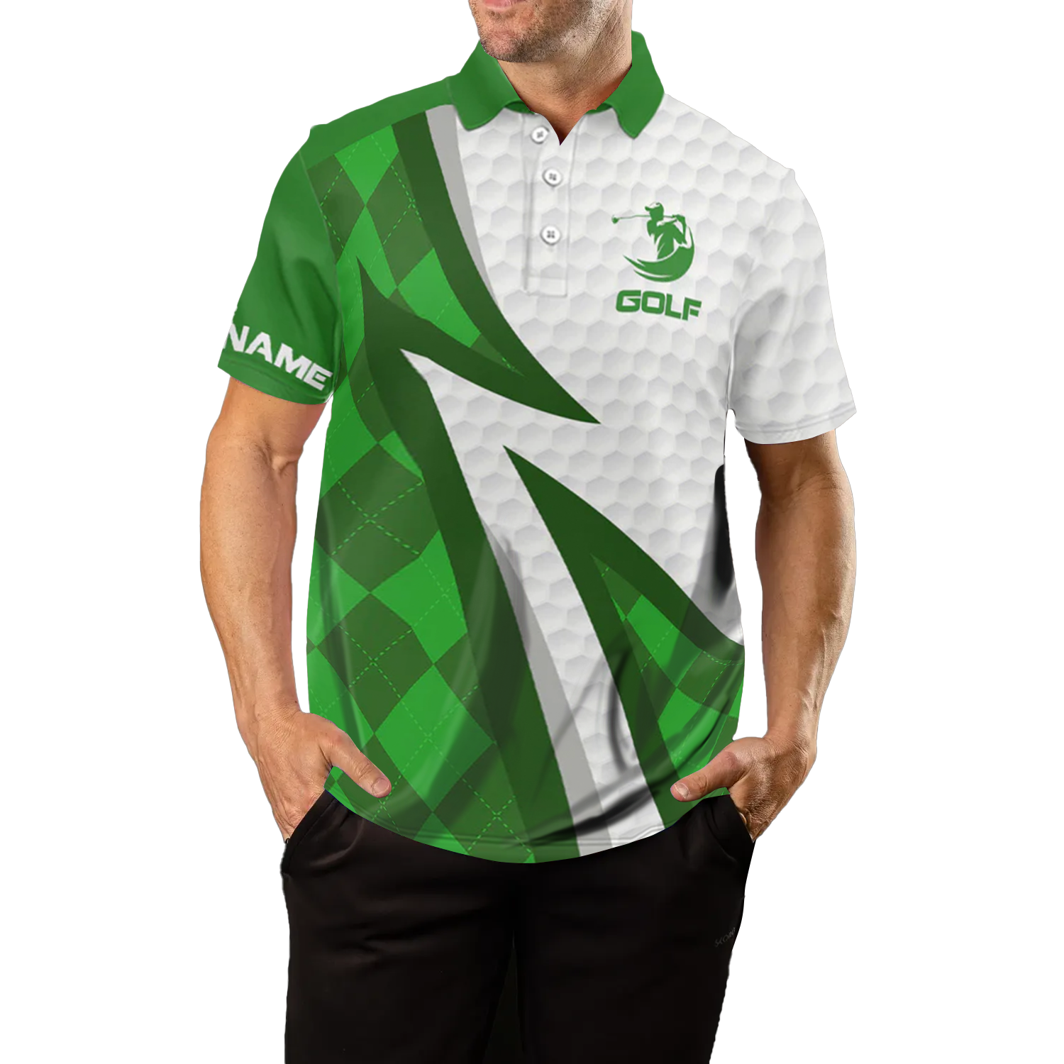 Personalisierte Herren Golf-Polo-Shirt in Grün mit Karomuster und weißem Golfball-Motiv N7168