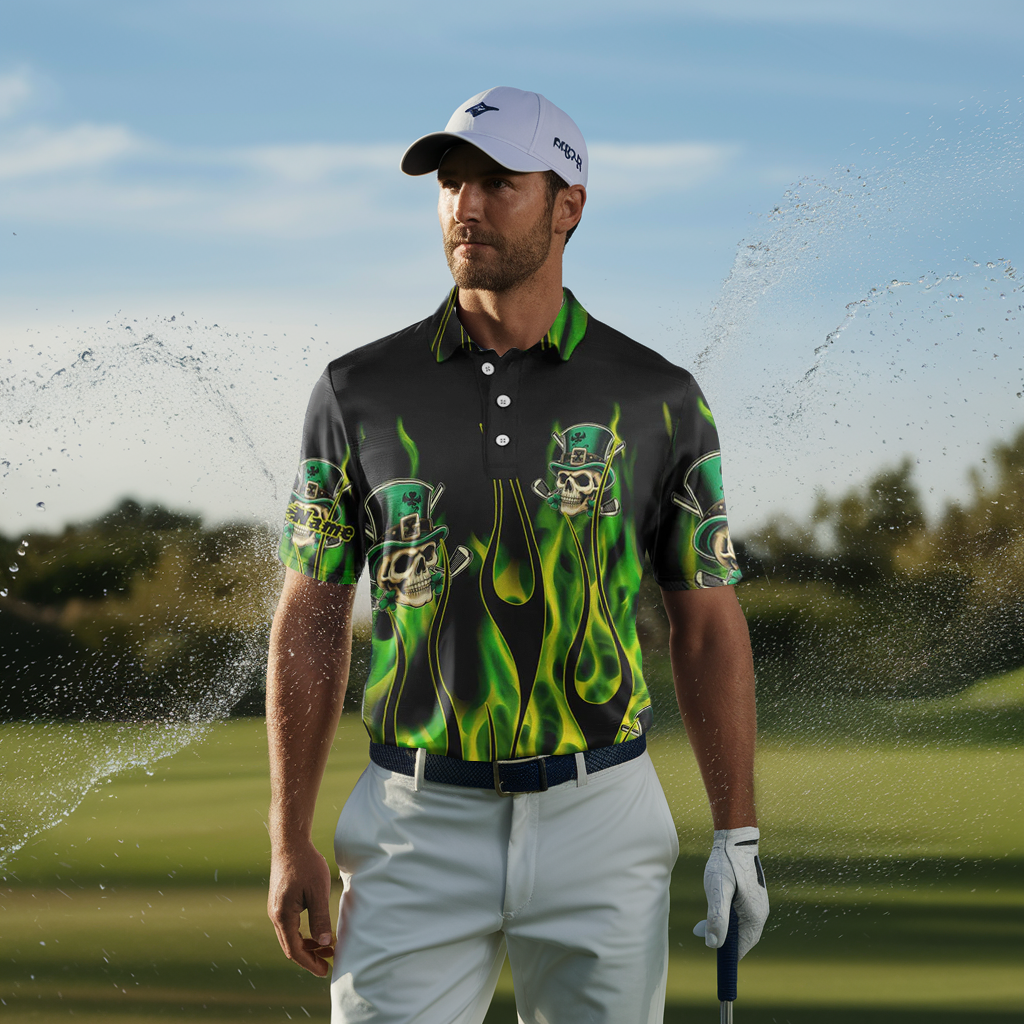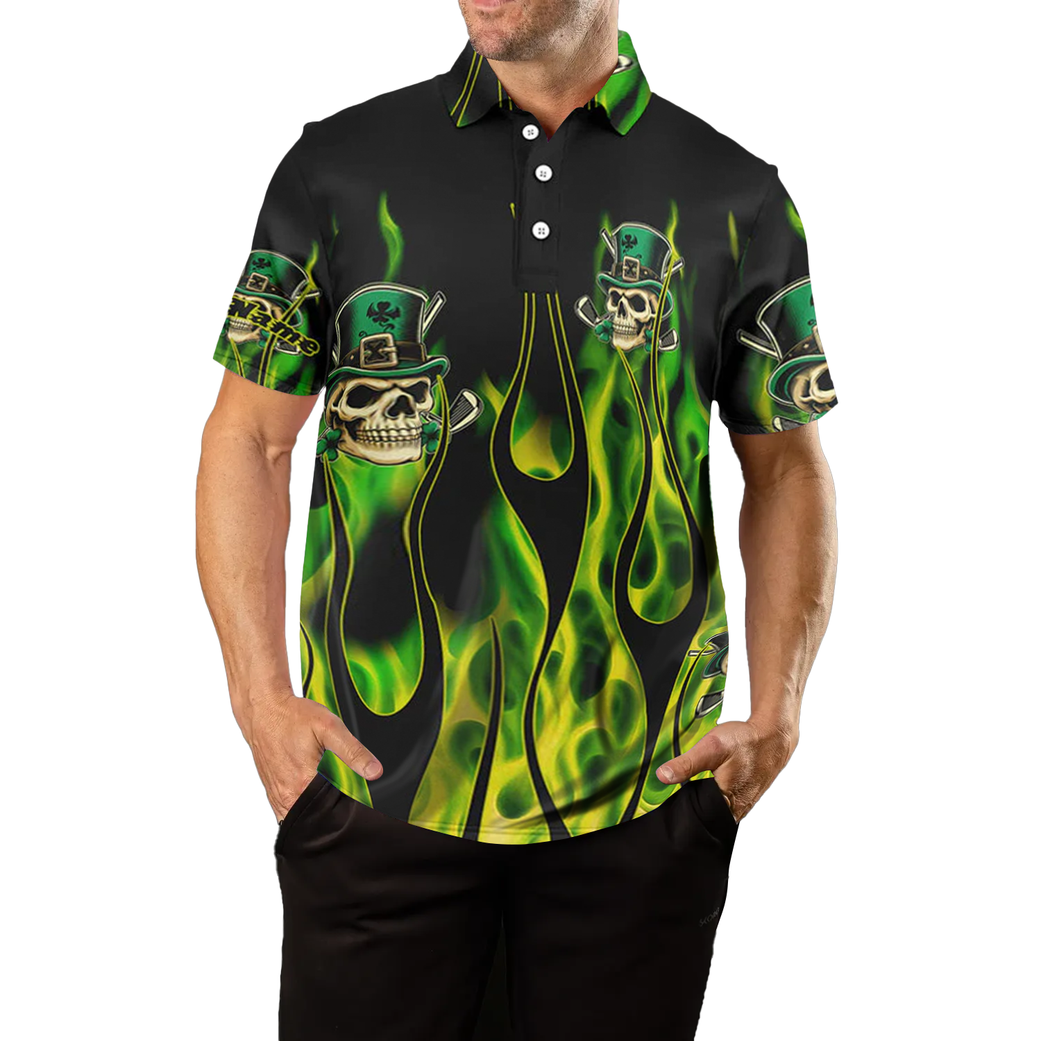 Grünes Golf-Polo für Herren mit Kleeblatt und Totenkopf – Individuelles St. Patrick's Day Golf-Outfit N7055