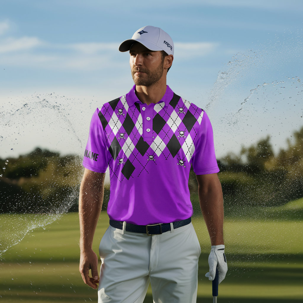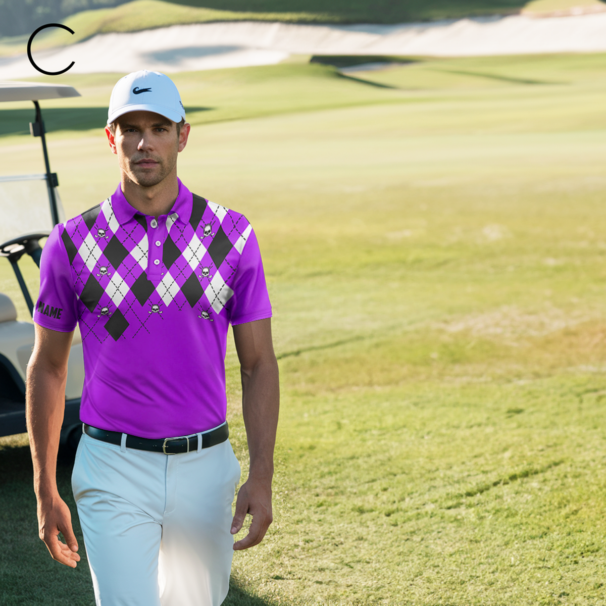Herren Golf Polo-Shirt in Lila mit Argyle-Muster und Totenkopf-Design N7213