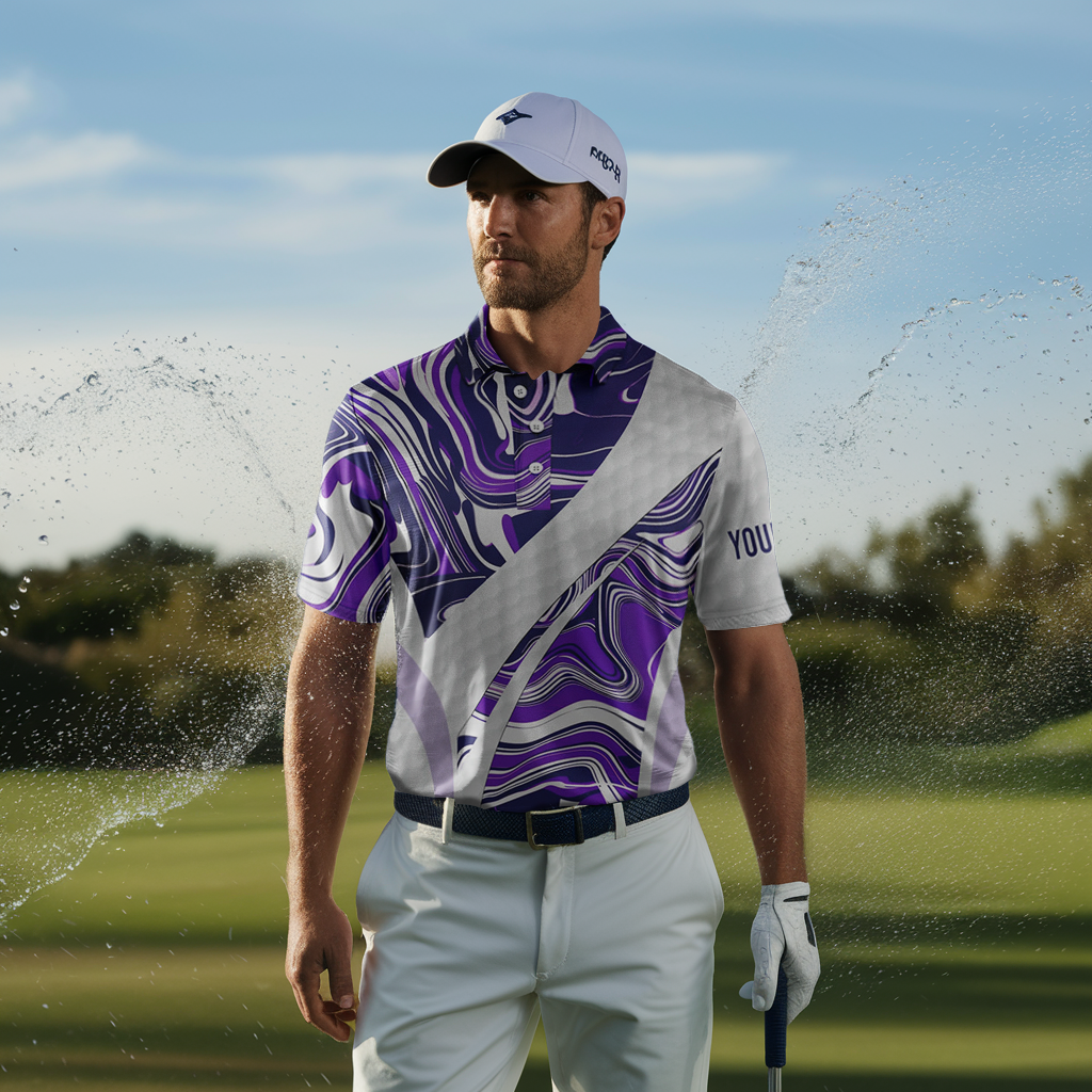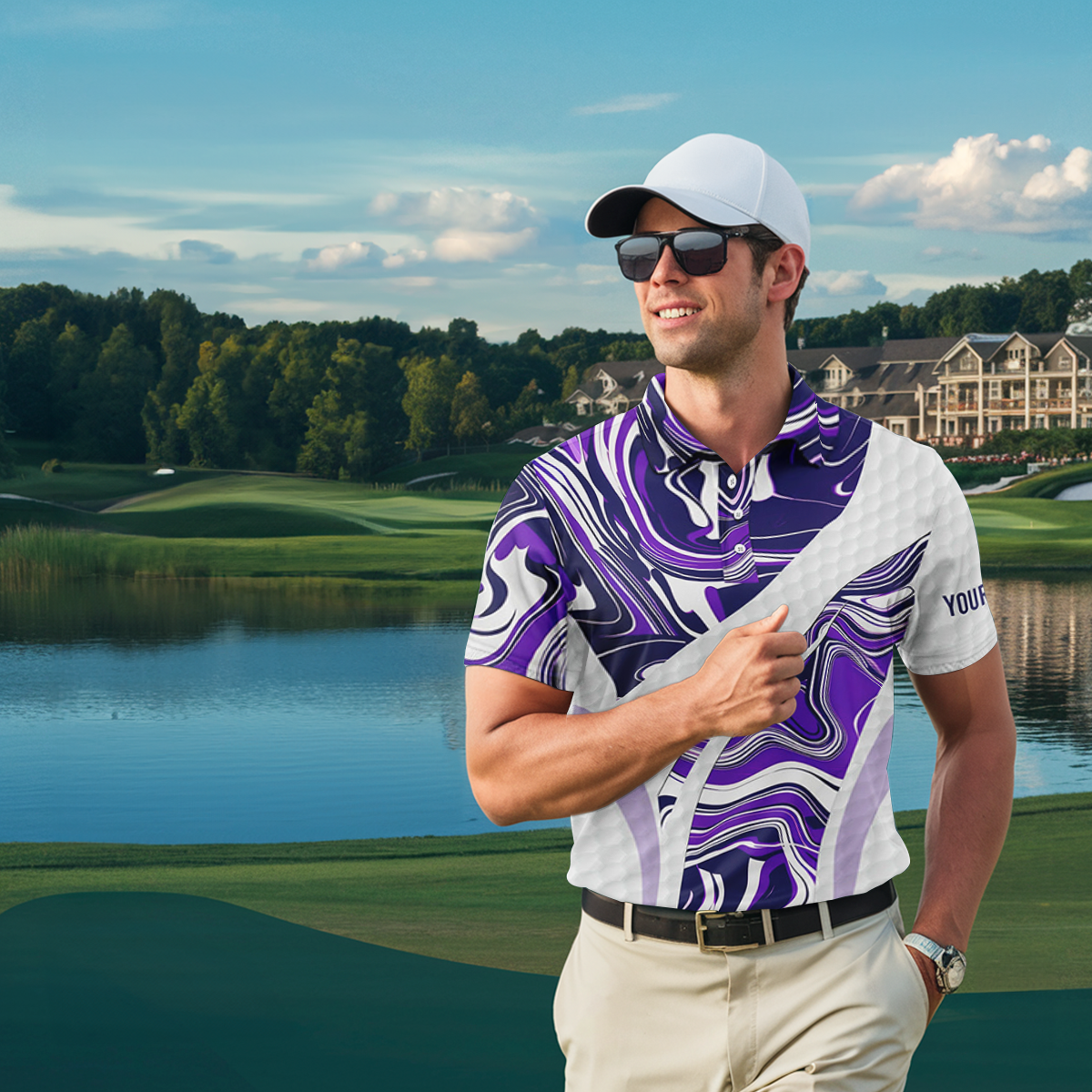 Herren Golf Polo Shirt in Lila Camouflage mit Individuellem Weißen Golfball-Design – Premium Golfoberteil, Perfektes Geschenk für Golf-Enthusiasten N7511