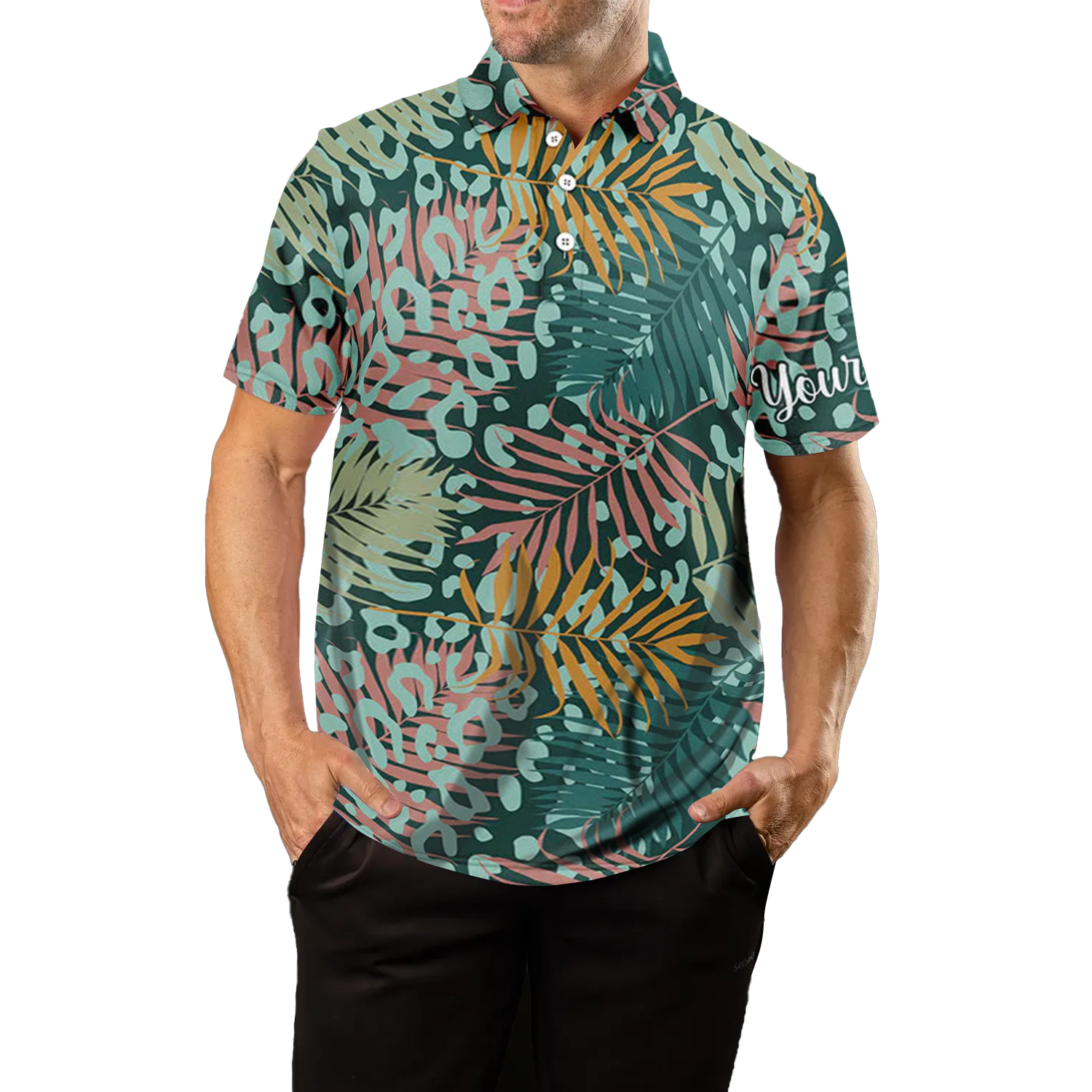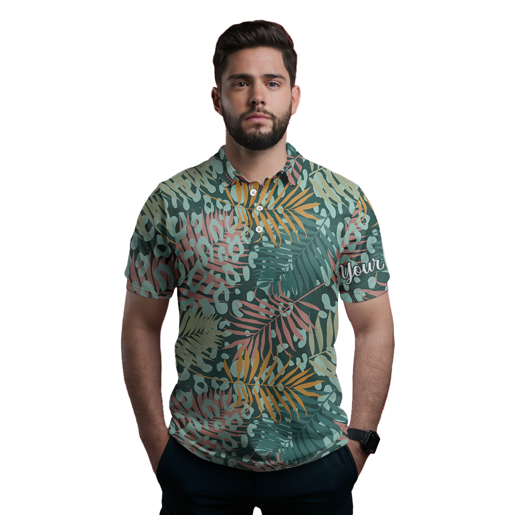 Herren Golf Poloshirts mit UV-Schutz und grünem tropischem Palmen-Leoparden-Muster N4161