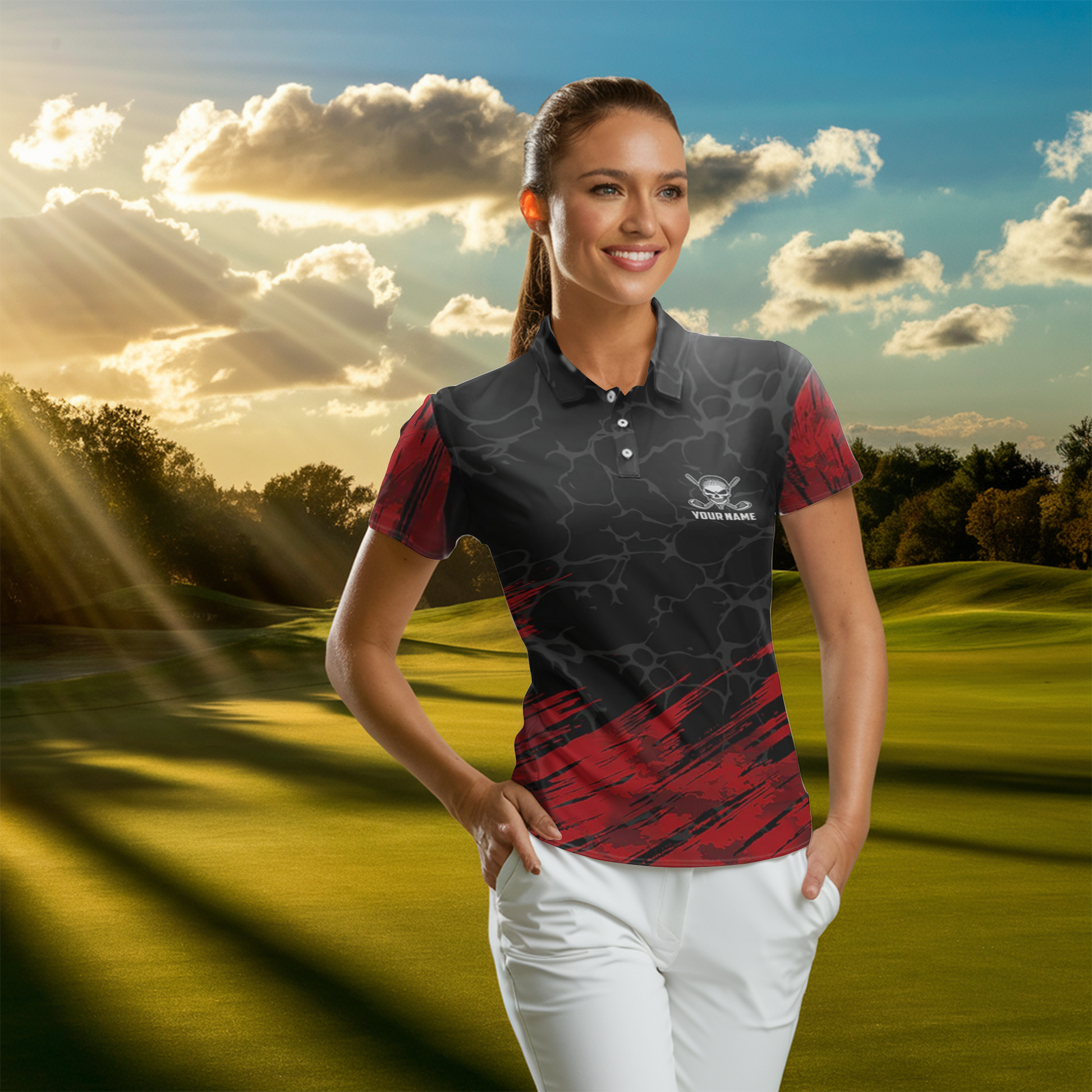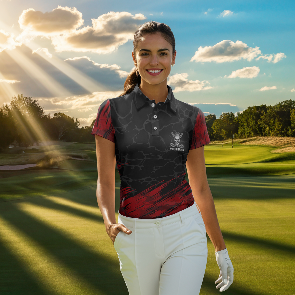 Individuelles 3D-Allover-Design Totenkopf Golf-Polo für Damen – Rotes und Schwarzes Golfoberteil L0177