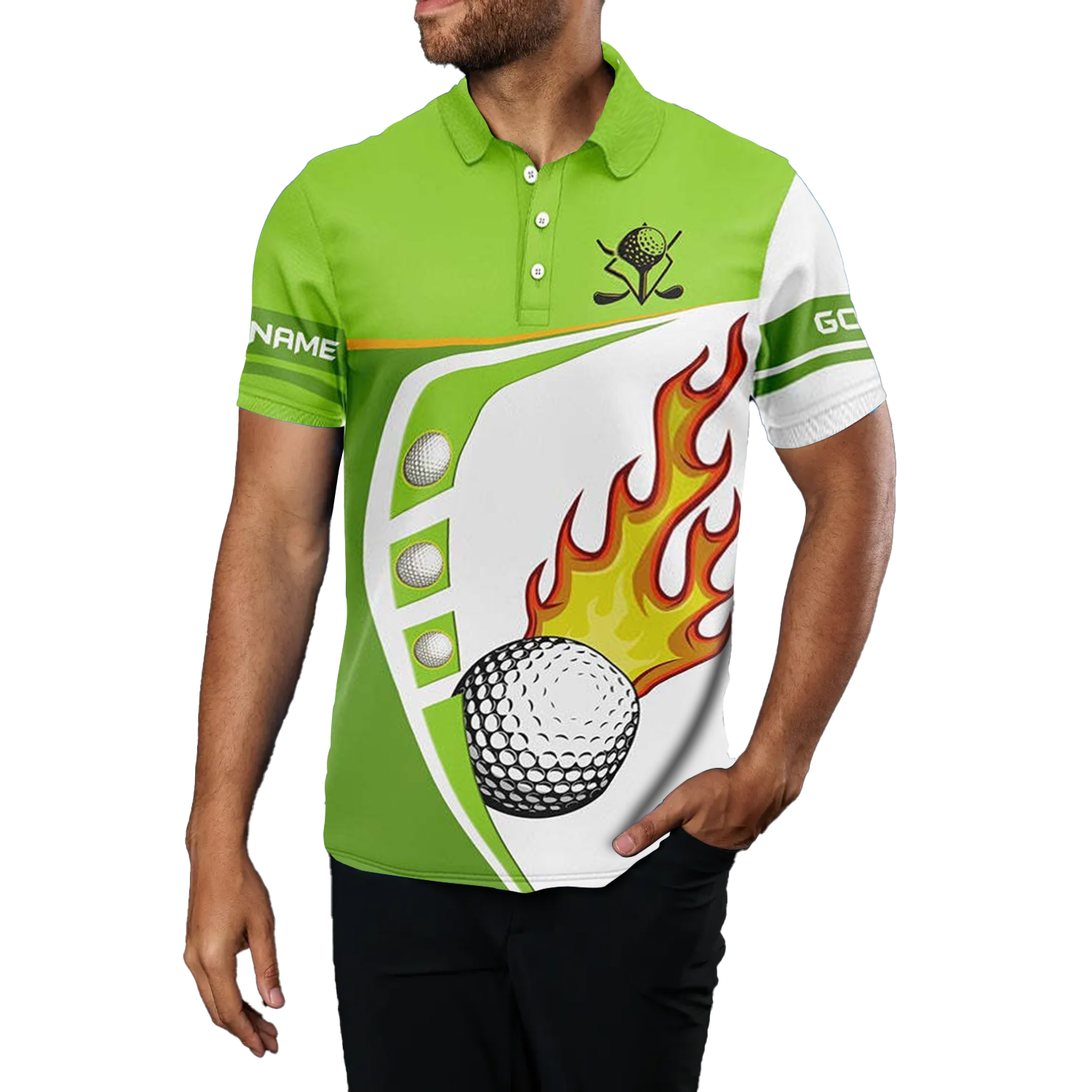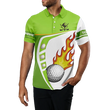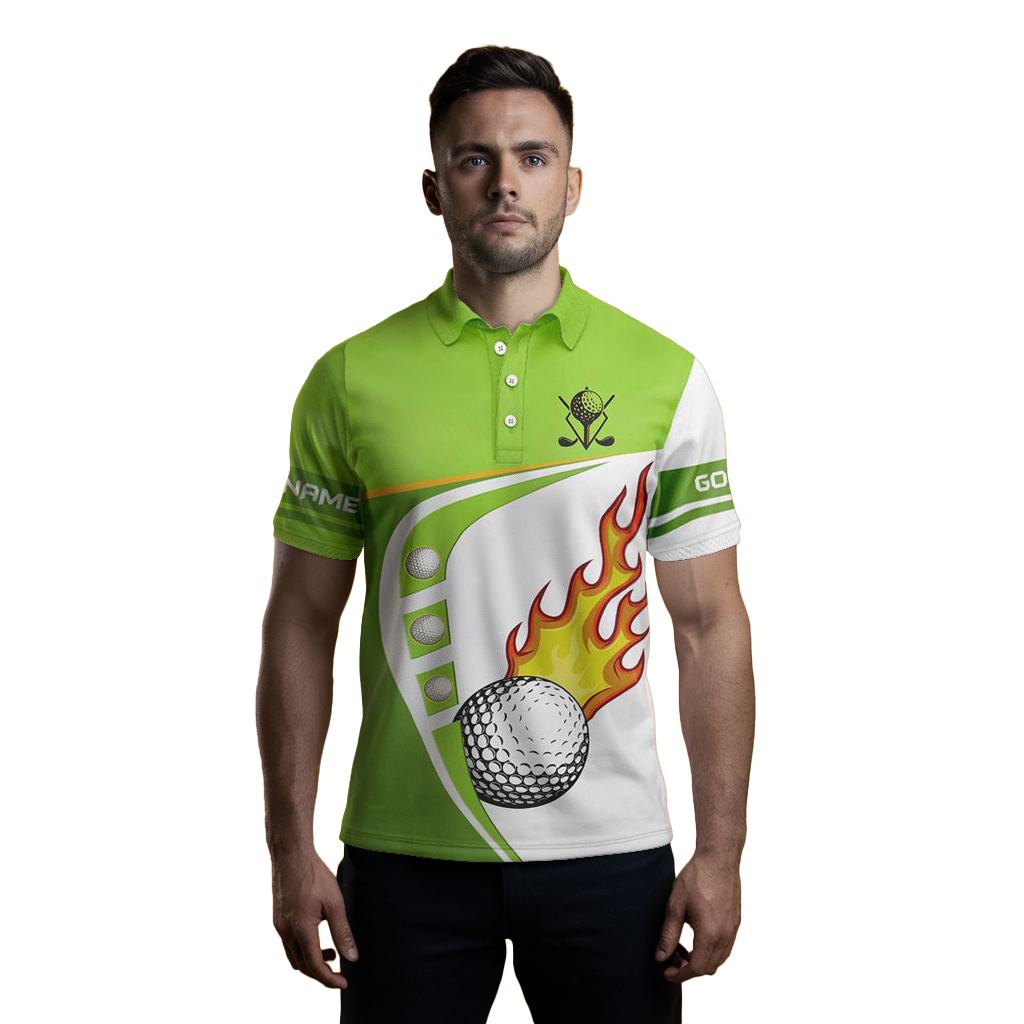 Herren Golf Polo-Shirt in Weiß und Grün mit Golfball-Feuerdesign – Hochwertige Golfbekleidung für Männer, Grünes Golfoberteil N7378
