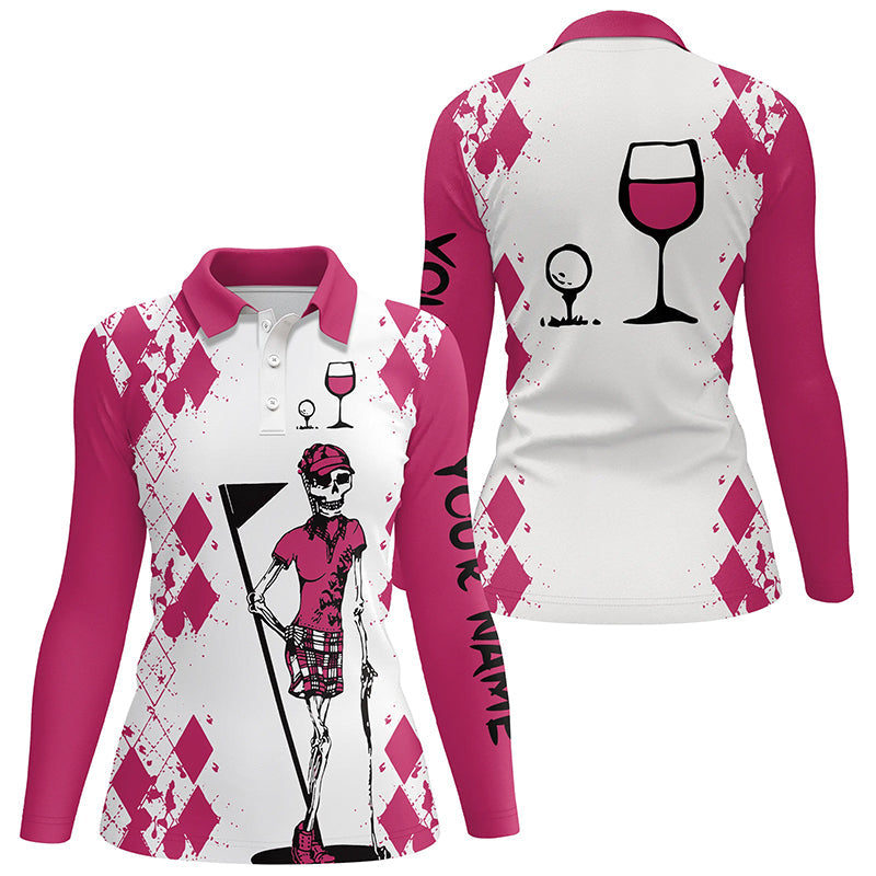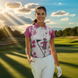 Personalisierbares Polo-Shirt für Damen mit Totenkopf-Motiv in Weiß und Pink – Golf & Wein N3451